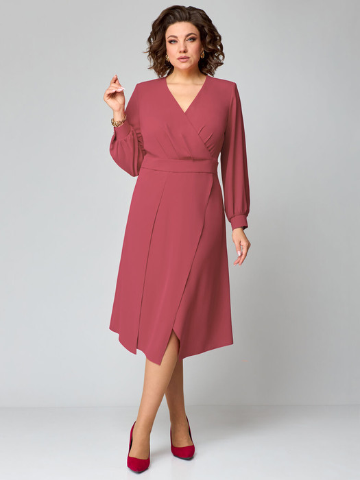 Элегантное женское платье прямого силуэта из легкой струящейся ткани. Перед отрезной по линии талии. Лиф  на запах с мягкими складками. Юбка на запах с отлетной деталью. Спинка со средним швом и талиевыми вытачками,  застежкой на потайную тесьму-молнию. V-образный вырез горловины. Рукав втачной одношовный присборен по низу на притачной манжете, застегивается на 1пуговицу и петлю. Платье с плечевыми накладками. Платье без подкладки.