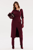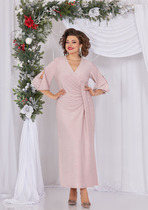 Платье А-силуэта выполнено из тонкого джинса. V-образный вырез горловины, застежка по планкам на 4 пуговицы и петли. По переду застрочены защипы, имеются нагрудные вытачки и накладные карманы. Рукав цельнокроеный с отложной манжетой. Спинка со средним швом и талевыми вытачками. По спинке настрочена декоративная деталь с терм аппликацией. По бокам имеется разрезы и карманы, низ закругленный. Имеется съемный пояс