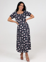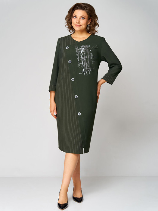 Платье свободного силуэта. По переду асимметричный подрез, имитирующий застежку. Спинка с потайной молнией в среднем шве, по низу разрез. Пи рукава из ткани компаньона. Карманы в боковых швах с фигурным входом. Украшение платья-печать и отделочные пуговицы
