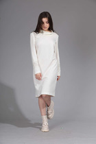 Платье полу прилегающего силуэта , расклешенное к низу, отрезное по линии талии со вставленным поясом на "венгерке". Рукав одношовный, втачной. Воротник плосколежащий, переходящий на спинке в рельефы, заканчивается бантом. Застежка на тесьму-молнию в среднем шве спинки до воротника.