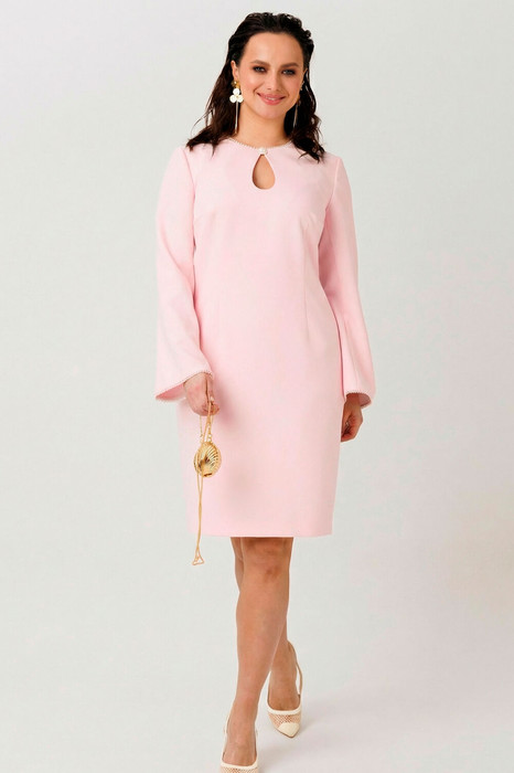 Элегантное платье-футляр, выполненное из плотной плательной ткани на подкладке. Дизайн акцентирован декоративной бейкой с жемчужным оформлением на горловине и манжетах рукавов — технически точная обработка краев, обеспечивающая долговечность и эстетику. Центральная деталь — пуговица-застежка на горловине, формирующая изысканный вырез-капель с эффектом глубины.