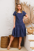 Платье женское полуприлегающего силуэта отрезное по линии талии. Лиф переда с нагрудными и талиевыми вытачками. Горловина круглая. По среднему шву спинки сверху застёжка потайная молния. Юбка расклешённая. Рукав одношовный втачной. Низ рукава со складками. Изделие дополняет пояс кушак. Платье без подкладки. Украшением служит брошь.