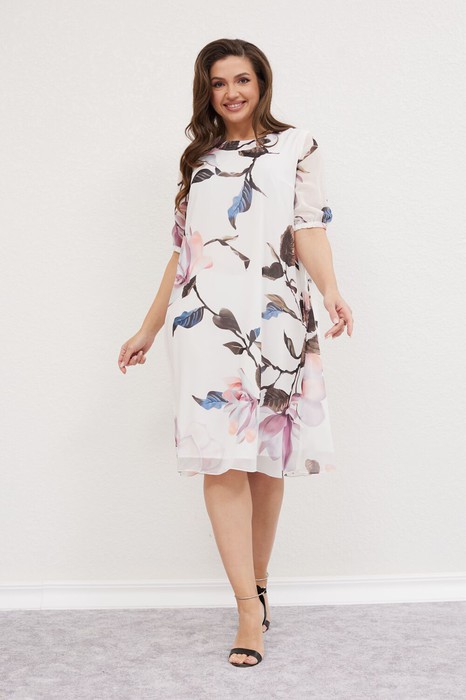 Платье женское А-силуэта, круглая горловина окантована и плавно переходит в заявязку на спине. Спинка со средним швом, у горловины разрез. Рукав втачной , одношовный. Низ рукава на резинке и регулируется завязками. Платье на подкладке.
