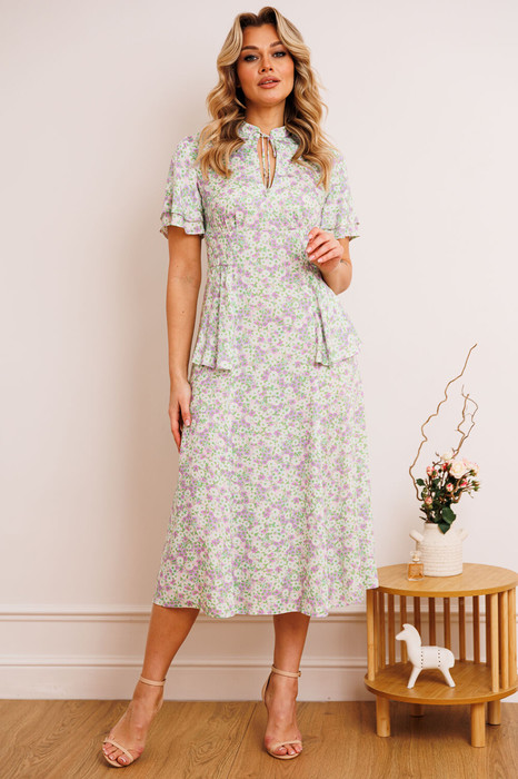 Платье из штапеля - прекрасный легкий вариант для жаркого лета. Платье приталенного силуэта, расширенное к низу. Отрезное по талии. По спинке молния в среднем шве. По переду небольшая сборка в области груди из подреза. В области бедер волан-баска из подреза, переходящий на спинку. Воротник - небольшая стойка с завязкой и вырезом капелькой. Рукав-волан двойной, разной длины.