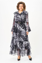 Нарядное женское платье свободного силуэта со спущенной линией плеча, выполнено из плательной ткани с пайетками (не тянется). Перед и спинка – цельные. Горловина по переду V-образной формы, по спинке – округлой формы, в вырез которой вставлен декоративный бант из шифона. Рукава втачные, одношовные. Платье на подкладке.