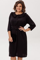 Платье комбинированное длиной макси, отрезное по линии талии с цельнокроеными рукавами. Застежка центральная с цельнокроеными планками на петли и пуговицы. Верхние части переда и спинки с вертикальными рельефами, начинающимися от линии плеча. Бантовая складка расположена по центру, боковые складки направлены от центра изделия в сторону бокового шва. Рукав цельнокроеный с боковыми частями переда и спинки с углубленной до линии талии проймой. По центру оката рукава сборка. Нижний срез рукава обработан притачной манжетой. Застежка манжеты на петли и пуговицы. Платье по линии талии собрано на резинку. Горловина изделия круглой формы, обработана воротником-стойкой, с застежкой на петли и пуговицы. Платье дополнено съёмным бантом. Бант съёмный, продевается в шлевки, расположенные на воротнике-стойке. В комплект к изделию идёт ремень из экокожи.