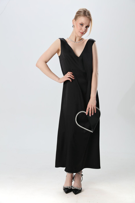 Платье прямого силуэта, с небольшим расширением к низу, длиной макси. Перед с нагрудной вытачкой из бокового шва. Вырез горловины переда и спинки имеют V-образную форму.