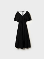 Платье макси прямого силуэта с округлым вырезом, отрезное по линии талии. Рукав немного приспущен, нижний край рукавов оформлен резинкой. По спинке вырез капелька с застёжкой на пуговицу. Изделие на подкладке. По низу юбки широкий волан.