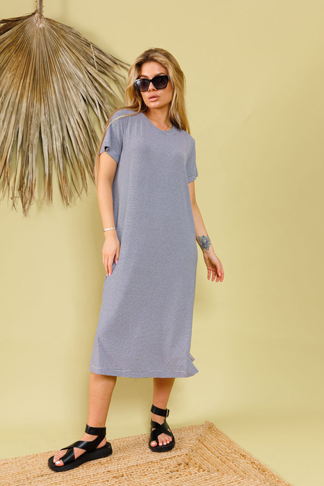 Платье свободного прямого кроя из вискозного полотна. Рукав втачной, планка по горловине. Вырез круглый. Низ изделия и рукавов имеют плоский шов. В боковых швах разрезы.