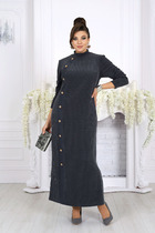 Женственное платье из замшевой ткани длиной миди свободного прямого кроя с горловиной, обработанной обтачкой. Рукава втачные длиной три четверти. Застежка центральная на петли и пуговицы. Накладные карманы. По боковым швам - разрезы. Изделие без подкладки.