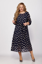 Комфортное платье, состоящее из лифа и юбки, имитирующее костюм-двойку. Лиф прямого кроя с втачным рукавом три четверти. Горловина обработана рубашечным воротником с отрезной стойкой. Застёжка центральная на пуговицы. По талии собрано на резинку. Юбка А-силуэта.