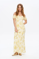 Платье макси комбинированное свободного силуэта с подрезом выше уровня талии. Спинка лифа цельная. Рукав втачной короткий. Нижняя часть платья со сборкой по верхнему шву. Горловина обработана обтачкой.
