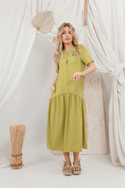 Воздумное платье трапециевидного силуэта отрезное ниже линии талии. Застежка центральная с отрезными планками на петли и пуговицы. Перед и спинка с притачными кокетками. Верхние срезы переда и спинки по линии соединены с кокеткой и собраны на сборку. Рукав втачной, одношовный. Нижний срез рукава со сборкой и разрезом, обработан притачной манжетой. Разрез рукава обработан обтачкой.
