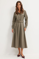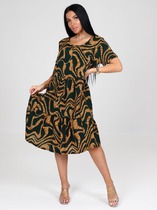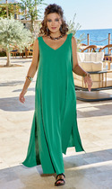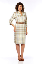 Платье трапециевидного силуэта без рукавов длиной мини с отложным воротником. Спинка и перед со средним швом и двойным втачным поясом. На переде небольшой разрез в шве по центру переда в области горловины. На юбке переда накладные карманы с вертикальным входом.