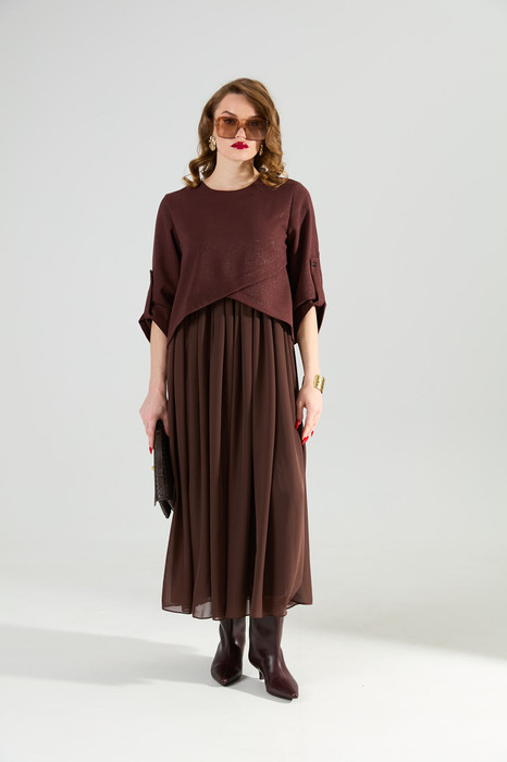 Платье макси комбинированное, двухцветное. Лиф фигурный по низу. Вырез горловины полукруглый, по спинке затежка на молнию. Рукава втачные на патах. Юбка на резинке, драпирующаяся, расширенного силуэта из шифона. На подкладке.