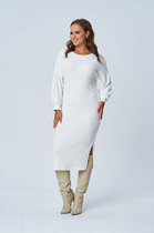Платье состоит из двух платьев: нижнего и верхнего. Верхнее платье макси прямого свободного силуэта с воланом по низу изделия. Рукав втачной с притачным манжетом. Горловина обработана плосколежащим воротником из отделочной ткани фигурной формы. Центральная застёжка на петли и пуговицы. Нижнее платье комбинация на регулируемых бретелях.