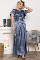 Платье комбинированное из двух тканей. Нижняя часть платья прямого силуэта, длинная , со сборкой по линии талии из отделочной ткани. Юбка на подкладке. Верхняя часть платья из основной ткани, частично на подкладке. Прямой силуэт, воротник пиджачного типа, рукав одношовный, втачной , с незначительно спущенной линией плеча, длинный, с притачной манжетой, декорированной разрезом. По линии ткани настрочная кулиса с завязками из основной ткани. Застежка центрально-бортовая на одну петлю и пуговицу функциональную и две пуговицы- имитация. Линия низа верхней части фигурная ассиметричная.