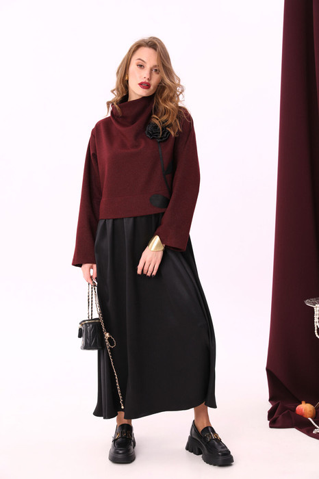 Платье прямого силуэта, состоящее из комбинации двух тканей - основной и отделочной. Воротник цельнокроеный хомут. Рукав одношовный, втачной, длинный. Нижняя юбка из отделочной ткани, со сборкой по линии талии. В виде отделки по левой части переда декоративный цветок из отделочной ткани.