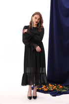 Платье макси прямого силуэта с округлым вырезом, отрезное по линии талии с воланом по низу изделия. Застёжка на петлю и пуговицу по спинке. Рукава втачные, собраны на резинку. Изделие на подкладке. В комплект к платью идут съёмные плиссированные манжеты с декоративными элементами.