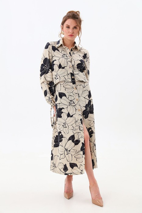 Платье макси с центральной отрезной застёжкой на потайную планку на петли и пуговицы.По переду и спинке цельнокроеные складки на уровне талии. Рукав втачной,одношовный рубашечноно типа. По низу рукава пробиты петли и вставлена завязка для фиксации сборки . Воротник рубашечный стояче отложной. В комплект к изделию идёт пояс из основной ткани для максимально комфортного регулирования объёма.