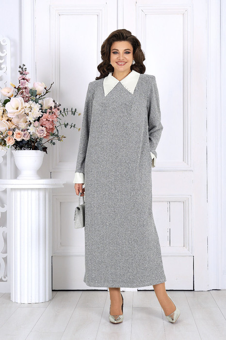 Платье женское полуприлегающего силуэта, выполнено из трикотажного полотна с фактурной лицевой стороной «люрекс». Модель с карманами в боковых швах, на трикотажной подкладке, с плечевыми накладками. Перед с нагрудными вытачками, направленными от пройм. В верхней части среднего шва спинки расположена застежка на тесьму-«молнию» (50 см), в нижней - разрез. Круглая горловина оформлена съемным воротником, декорированным спереди пришивными камнями. Рукав длинный, втачной, низ оформлен съемной манжетой с разрезом. Воротник и манжеты выполнены из сатина и пристегиваются к изделию при помощи прорезных петель и пуговиц.