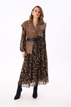 Платье женское приталенного силуэта, выполнено из вискозного полотна. Модель без подкладки, без плечевых накладок. По линии талии спинки и переда -- отрезной пояс с широкой эластичной лентой внутри; по середине пояса прострочена отделочная строчка. Перед с внешней застежкой на 8 петель и 8 пуговиц; по линии талии – дополнительная внутренняя застежка на 1 пуговицу. В верхней и нижней части переда настрочены фигурные накладные карманы с бантовой складкой посередине и клапаны, застегивающиеся на 1 петлю и 1 пуговицу. Горловина оформлена отложным воротником на отрезной стойке. Рукав короткий, реглан; дополнен патой, зафиксированной на плечевом шве двумя шлевками и пуговицей. Длина платья – 110 см; длина рукава (от горловины) – 32 см.