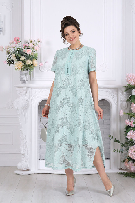 Платье женское А-силуэта, выполнено из гипюра х/б. Модель на х/б подкладке. По центру полочки оформлена застежка с притачными планками до линии груди. На планке обработана застёжка на 5 навесных петель и 5 пуговиц. Рукав в платье втачной короткий.  Перед с нагрудными вытачками, направленными от пройм.  Горловина оформлена воротником стойка. По боковым швам, внизу платья оформлены фигурные разрезы.