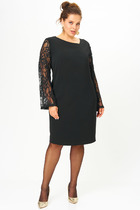Платье женское, полуприлегающего силуэта, выполнено из гипюра и плательной ткани «сатин». Перед и спинка состоят из двух разных по длине слоев: нижний короче верхнего на 5 см. Модель без подкладки, с плечевыми накладками. Низ платья и рукавов оформлен фестонами. Перед в верхнем и нижнем слоях с нагрудными вытачками, выходящими из пройм. Спинка с талиевыми вытачками и средним швом, в верхней части которого обработана застежка на потайную тесьму-«молнию» (50см), в нижней – разрез. Вырез горловины переда и спинки округлый, углубленный по переду. Рукав короткий, втачной. Верхний и нижний слои платья скреплены по среднему шву, плечевым и проймам. Длина платья (верхний слой)-108 см, длина рукава-26 см.