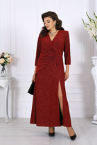 Платье женское полуприлегающего силуэта, выполнено из трикотажного полотна с фактурной лицевой стороной «люрекс». Модель на трикотажной подкладке, с плечевыми накладками. На правой части переда, вдоль отрезного пояса, заложены косые односторонние складки; детали лифа и юбки скреплены на запах. Низ платья асимметричный: правая часть переда удлинена к центру и оформлена углом, левая -- скругленная и входит в правый боковой шов. На спинке обработаны талиевые вытачки.  В левом боковом шве предусмотрена застежка на потайную тесьму-«молнию» (35 см). Рукав длиной 3/4, втачной. Платье дополнено съемным «цветком» из основного полотна. Длина платья-108 см; длина рукава-41 см.