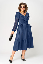 Платье приталенного силуэта на подкладке из итальянского шифона. Горловина V-образного выреза с застежкой на петли и пуговицы, с воротником стойкой. На застежке отделочные воланы к плечевому шву. По отрезной линии талии сборка,а в нижней части платья притачной волан. Рукав на манжете со сборкой по линии оката и низа.