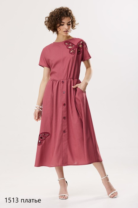 Классическое платье из льняного полотна, отрезное по талии, с боковыми карманами, по нижней части заложены складки застежка-молния. Нижняя часть платья с центральной застёжкой на петли и пуговицы. Верх и них платья декорированы дизайнерской вышивкой.