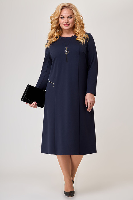Трикотажное платье сделает Ваш образ неповторимым. А-образный силуэт придаст стройность и свободу движения. Перед платья с нагрудными вытачками из боковых швов. С левой стороны, в области бедер, есть нефункциональный карман с молнией. Горловина переда круглая. Рукав двухшовный, длинный. Спинка со средним швом. В комплект входят бусы, которые дополнят Ваш образ.
