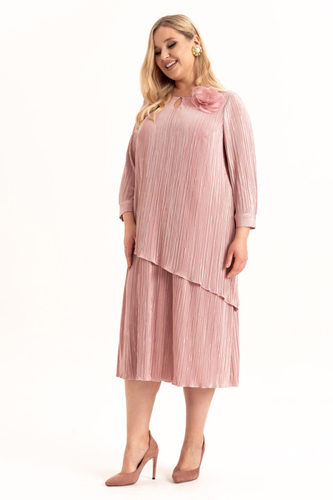 Это итальянское платье- имитация костюма  нарядного стиля больших размеров станет отличным выбором для тех, кто ценит элегантность и стиль. Платье сочетает в себе комфорт и долговечность. Ткань "плиссе" придает изделию оригинальную рельефную текстуру, которая делает его особенно привлекательным. Основная особенность этого платья — силуэт в виде трапеции, который подходит для разных типов фигур, а также каплевидный декор по горловине полочки. Длина юбки — миди. Платье предназначено для женщин плюс сайз и станет идеальным выбором для вечерних мероприятий, новогодних праздников, свадеб или юбилеев. Благодаря универсальному дизайну ее можно сочетать с различными нарядами. Это отличный подарок для жены, мамы, сестры или девушки. Платье украшено брошей-цветком и съемным поясом, которая добавляет элегантности и шарма, и ее можно заменить на другие аксессуары, адаптируя наряд под разные события и настроения. Легкая трикотажная подкладка делает его еще более комфортным, а рукава 3/4 и рубашечный манжет с застежкой на петлю и пуговицу  делают платье подходящим для большинства женщин. Выбирая это  платье  больших размеров  , Вы получаете не только стильное и элегантное платье, но и качественное удобное изделие, которое скрывает все неровности фигуры и  будет Вашим верным спутником на любых праздниках .