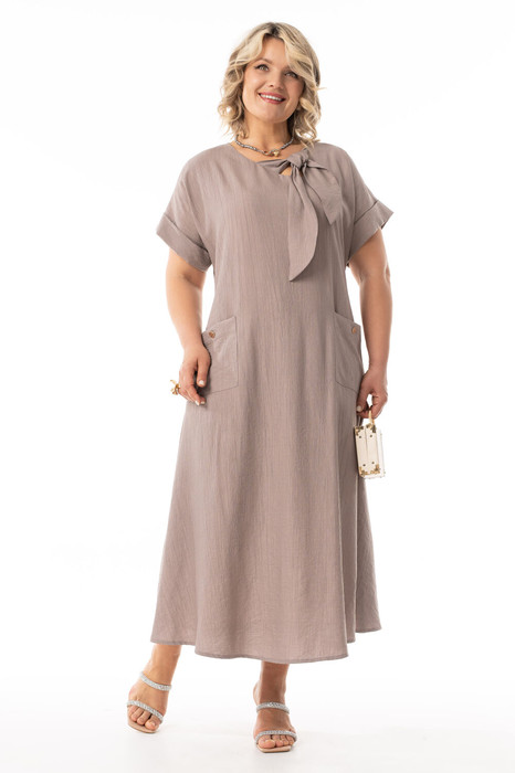 Нарядно-повседневное платье длины макси , выполненное в приглушенном цвете капучино. Модель отличается свободным А-образным силуэтом, который обеспечивает комфорт при носке. Платье из натуральной, дышащей ткани имеет А-силуэт с плавным расширением к низу. Рукав спущенный, короткий, дополнен отложными манжетами. Округлый вырез горловины, украшенный декоративным бантом-завязкой с левой стороны, что добавляет образу женственности. Спереди расположены два больших накладных кармана, декорированных пуговицами. Ткань имеет выраженную вертикальную текстуру («жатка» или имитация льна), что характерно для летних моделей из вискозы.Нарядно-повседневный стиль, с элементами стиля бохо или городского кэжуал. Благодаря лаконичному дизайну, такое платье универсально. В нем будет комфортно и на день рождения, на свадьбе, последнем звонке, выпускном и просто на вечерней прогулке. Оно хорошо сочетается с открытыми босоножками на плоском ходу или небольшом каблуке (как на фото) и аксессуарами из натуральных материалов: соломенными сумками, деревянными или металлическими украшениями.