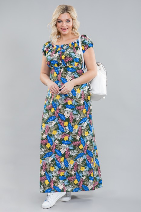 Легкое повседневное платье прилегающего силуэта длиной макси, выполнено из хлопкового полотна. Платье с отрезной завышенной линией талии. Перед и спинка верха целые со сборкой по шву притачивания. Низ переда целый, спинка с отрезными бочками, средняя часть спинки по талии собрана на шпульную резину. Рукав – реглан по низу собран на резину. Длина рукава в 46 р-ре – 15 см. в 58 р-ре – 17 см., ширина рукава по низу в 46 р-ре – 36 см. в 58 – 42 см. Горловина со сборкой на резину, что позволяет носить платье с открытыми плечами. Платье без подклада и застежек. Длина изделия по середине спинки в 46 р-ре –В В 130 см. в 58 р-ре – 136 см.