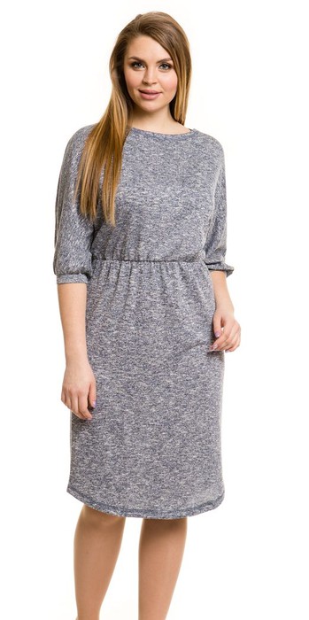 Повседневное платье свободного силуэта, выполнено из меланжевого трикотажного полотна. Платье по линии талии отрезное, собрано на резину. Спинка со средним швом. Рукав цельнокроеный свободный, со сборкой по низу и небольшим притачным манжетом. Длина рукава от горловины в 48 р-ре – 49 см. в 58 р-ре – 51 см, обхват рукава по низу в 48 р-ре – 23 см., в 58 р-ре – 27 см. Горловина в форме Лодочка обработана на плоскошовке. По горловине и фигурному низу платья проложена отделочная строчка из ниток контрастного цвета. Платье без подклада и застежек. Длина изделия в 48 р-ре – 110 см., в 58 р-ре – 112 см.