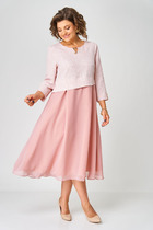 Платье состоит из верхней, нижней и средней части имитирующей корсет. В верхней части спинки в среднем шве расположена капелька, в нижней части спинки расположен разрез. В левом боковом шве расположена застежка на тесьму-молнию. Длина платья – мидакси.