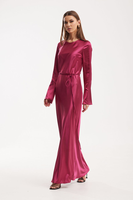 Платье женское полуприлегающего силуэта, втачного покроя. Платье на подкладке. Перед и спинка покроены по косой, что придает модели более плавные линии фигуры. По переду расположены нагрудные вытачки, по спинке – талиевые. Платье к низу слегка расширено, длина «макси». Горловина округлой формы. Рукав одношовный с притачной нижней частью, что расширяет рукав к низу. По спинке горловина переходит в капельку, которая фиксируется пуговицей. Платье выполнено из атласной плательной ткани.