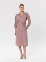 Платье выполнено из джинсовой ткани, полуприлегающего силуэта, с застежкой на отделочную молнию и планку, с тремя петлями-пуговицами. Платье с отрезной деталью в области линии талии, в которую вставлены шлевки и протягивается пояс с полукольцами. Спина с кокеткой встречной складкой по центру на талии. По переду складки в области груди, в нижней части накладные карманы. По центру переда разрез. Горловина оформлена стояче-отложным воротником. Рукав втачной, короткий.