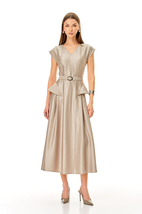 Платье женское, приталенного силуэта. Платье отрезное по линии талии, выполнено из нарядной ткани. Лиф платья с вытачками от линии талии, У-образным вырезом и со спущенными плечами. Верх спинки с вытачками талиевыми, средним швом, в который вставлена потайная молния. Нижняя часть платья имеет боковые подрезы, в которые вставлены расширенные «крылья», отстроченные отделочными строчками по 1 см. В боковых частях юбки по две складки, направленные к боковым швам. К платью прилагается пояс.