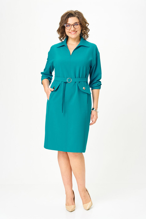 По переду центральный шов, сверху переходящий в вырез, а так же бочок из проймы, с нагрудной вытачкой, с карманами в шве в нижней части платья. Над карманом пришит клапан с декоративной пуговицей. Воротник стояче-отложной. Спинка со средним швом, снизу заканчивающимся разрезом. Рукав рубашечного покроя, одношовный, длиной 7/8, к низу притачивается манжета – на половину собранная на резинку. К платью прилагается съемный пояс с отделочной пряжкой.