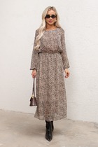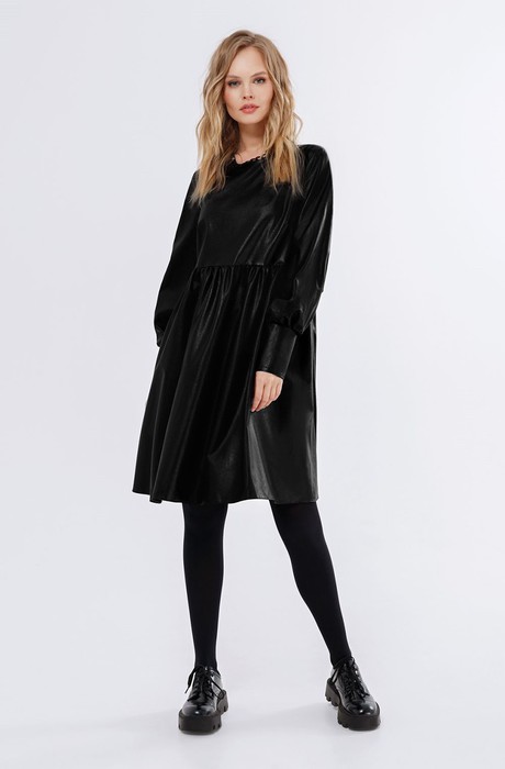 Платье-трапеция из экокожи. Детали: свободный силуэт, завышенная отрезная линия талии, нагрудные вытачки, рукава втачные длинные со сборкой по низу, высокие притачные манжеты с застежкой на пуговицы и навесные петли, потайная застежка-молния по спинке, карманы в швах