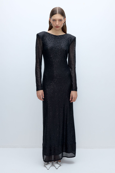 Макси-платье прилегающего силуэта из ткани в пайетки.