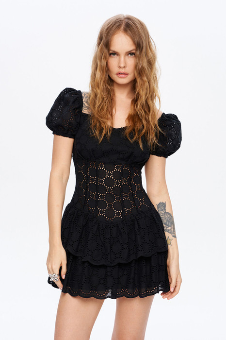 Приталенное мини-платье из хлопкового ришелье.