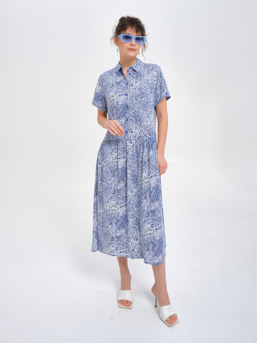 Модель с фигурным подрезом ниже линии талии. В верхней части переда застёжка на пуговицы. Нижняя часть платья со сборкой. В боковых швах высокие разрезы. По низу рукава отложная манжета с петлёй и пуговицей.