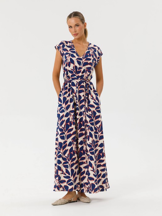 Модель А-образного силуэта, со спущенным плечом и V-образным вырезом горловины. Горловина и пройма окантованы. В боковых швах карманы. Талия подчёркнута завязывающимся поясом-шнурком.