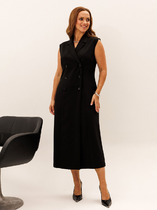 Вечернее платье прилегающего силуэта в длине макси, отрезное по линии талии, выполнено из эластичного полотна бифлекс. Ассиметричный вырез лифа с присборенным боковым швом по левой стороне. По линии талии обработан вырез, переходящий на спинку. Одно плечо открыто. Рукав длинный втачной. Юбка с драпировкой по рельефу, который переходит в высокий разрез по левой стороне.