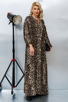 Женское платье полуприлегающего силуэта, отрезное по линии талии, выполнено из джинсовой ткани с анималистичным принтом. Фигурный вырез горловины с притачным воротником-стойкой. Лиф с центральной застежкой на петли ,пуговицы и с накладными карманами с клапанами. Юбка с разрезом в среднем шве, который обеспечивает свободу движения. Рукава втачные с притачной манжетой с застежкой на пуговицы. Спинка с талиевыми вытачками. В комплекте прилагается ремень.
