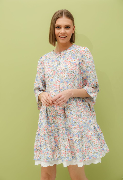 Платье свободного силуэта отрезное по линии талии, с центральной застежкой на петли-пуговицы. Низ платья состоит из двух воланов на подкладке с декоративным кружевом.                                          Длина изделия -97см. Длина рукава-46см.