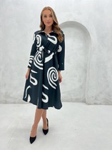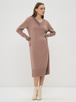 Стильное платье полуприлегающего силуэта, выполнено из трикотажного полотна. Горловина округлой формы, с центральной застежкой на петли и 4 разных пуговицы. Рукава длинные втачные. В боковых швах обработаны высокие разрезы.